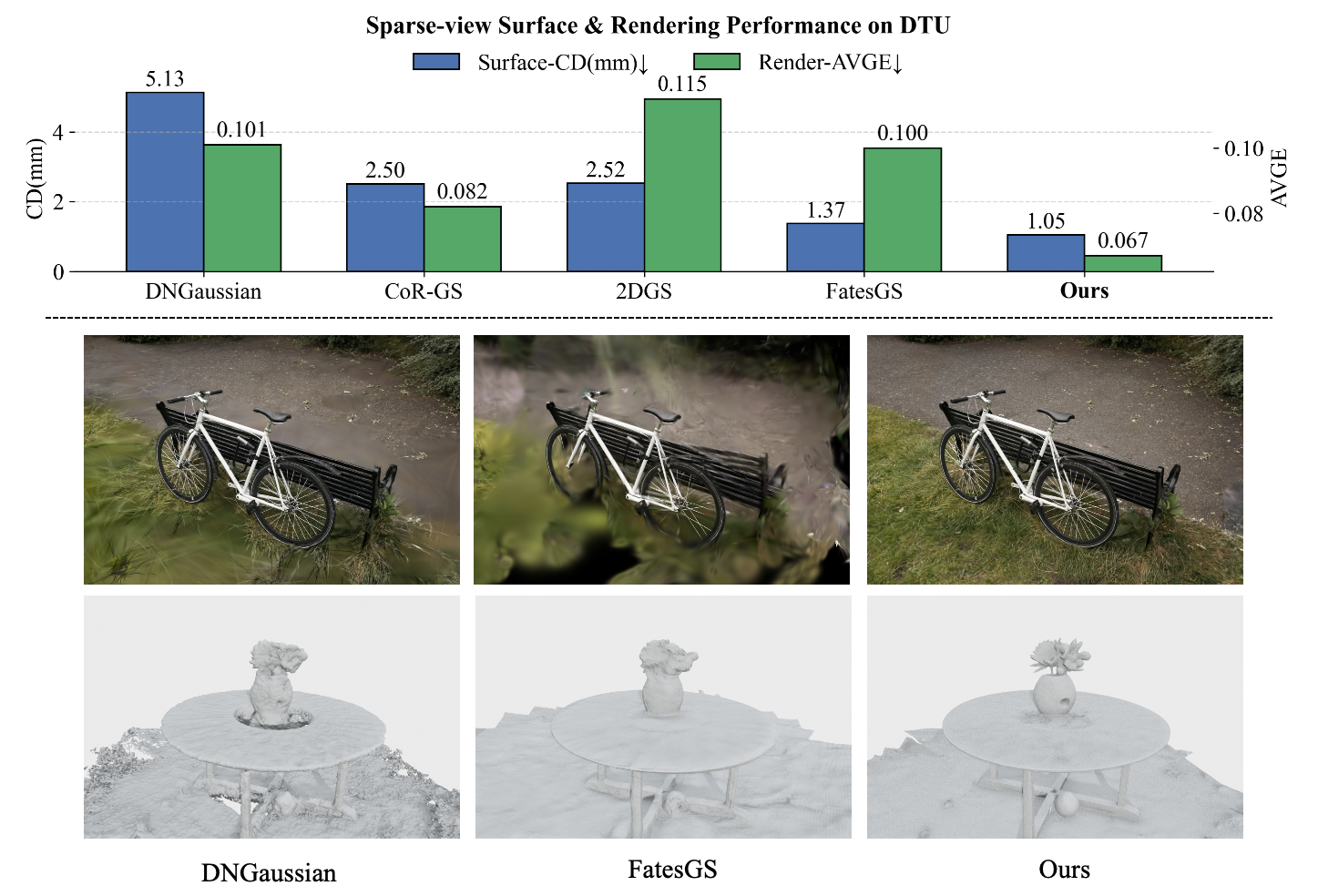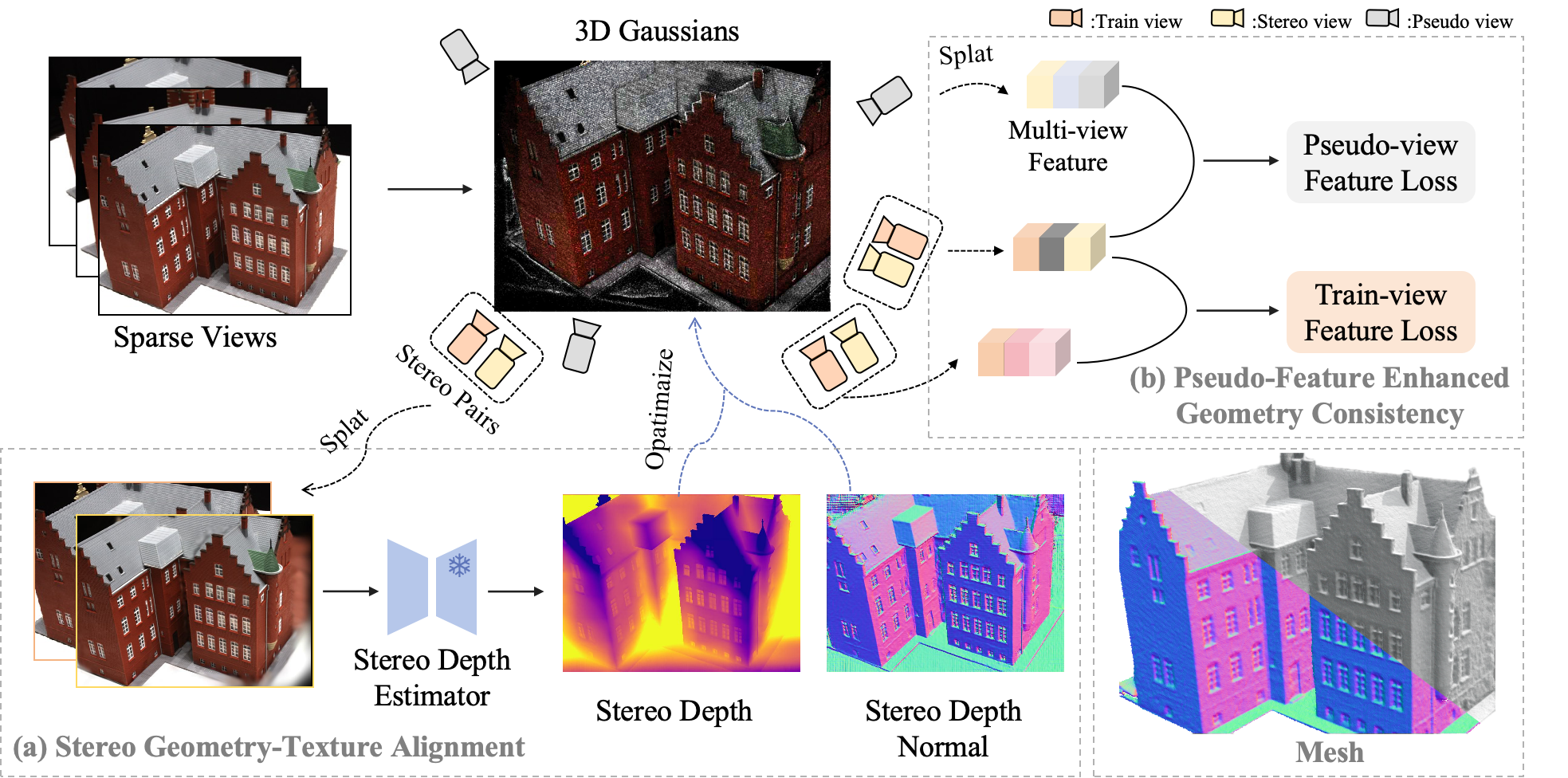 Recent advances in optimizing Gaussian Splatting for scene geometry have enabled efficient reconstruction of detailed surfaces from images. However, when input views are sparse, such optimization is prone to overfitting, leading to suboptimal reconstruction quality. Existing approaches address this challenge by employing flattened Gaussian primitives to better fit surface geometry, combined with depth regularization to alleviate geometric ambiguities under limited viewpoints. Nevertheless, the increased anisotropy inherent in flattened Gaussians exacerbates overfitting in sparse-view scenarios, hindering accurate surface fitting and degrading novel view synthesis performance. In this paper, we propose SparseSurf, a method that reconstructs more accurate and detailed surfaces while preserving high-quality novel view rendering. Our key insight is to introduce Stereo Geometry-Texture Alignment, which bridges rendering quality and geometry estimation, thereby jointly enhancing both surface reconstruction and view synthesis. In addition, we present a Pseudo-Feature Enhanced Geometry Consistency that enforces multi-view geometric consistency by incorporating both training and unseen views, effectively mitigating overfitting caused by sparse supervision. Extensive experiments on the DTU, BlendedMVS, and Mip-NeRF360 datasets demonstrate that our method achieves the state-of-the-art performance.